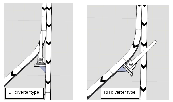 The DiverterType LH/RH property in defined by looking upstream from the conveyor it is attached to: