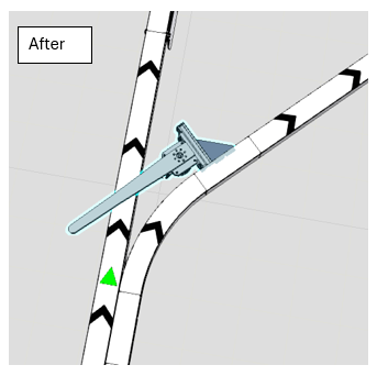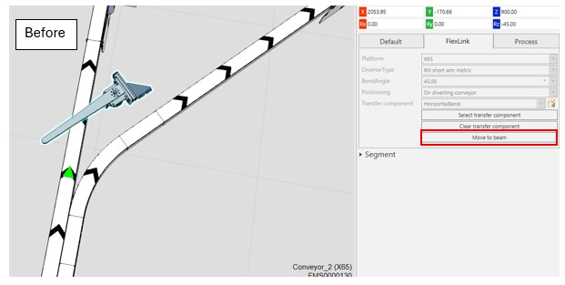 If you choose “On non diverting conveyor” you place and configure the component in the same way as for the 60 degrees configuration. If you choose “On diverting conveyor”, the first two steps are the same (positioning and choosing the bend component), but after these steps you can click on “Move to beam” and the component will automatically be placed on correct position towards the diverting conveyor: