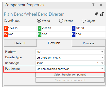 Before you connect the component you first choose platform, diverter type and bend angle in the Component Properties FlexLink tab: